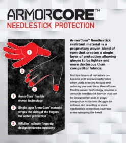 - ArmorCore™ technology that meets ASTM F2878 level 2 needlestick puncture protection across the palm, fingertips, and seams.