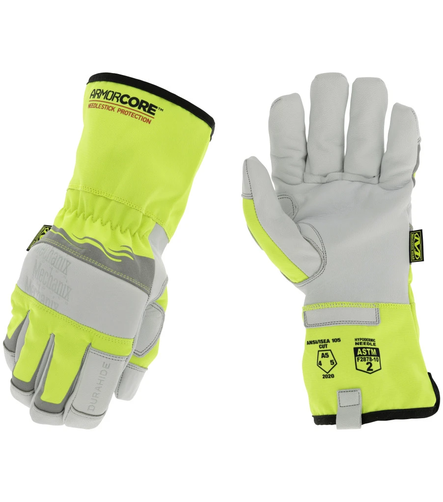 The Mechanix Wear Durahide™ Hi-Viz Needlestick Protection glove is designed for those who handle glass, needles, sharp blades, or cables on the job. The combination of high-performance Durahide™ Leather and ArmorCore™ needlestick resistant technology across key areas of the fingertips and seams helps block, deflect, and minimize injuries from sharp objects without sacrificing dexterity, breathability, and comfort.